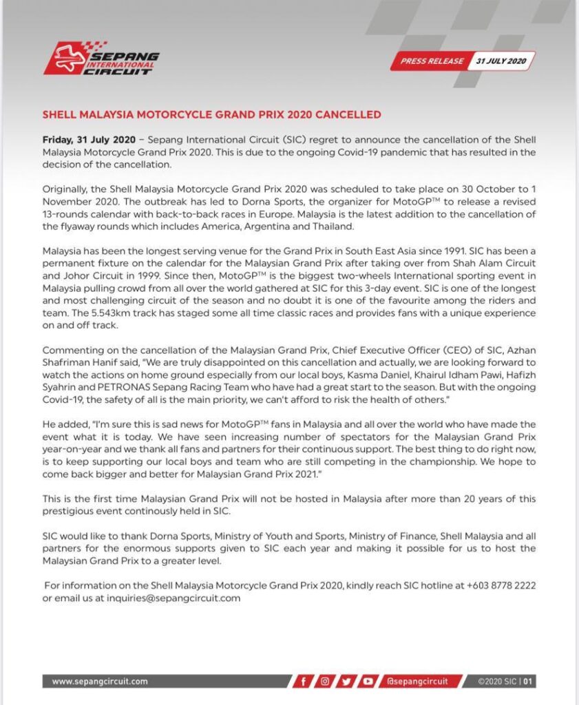 THE FIM, IRTA AND DORNA SPORTS REGRET TO ANNOUNCE THE CANCELLATION OF THE GRAN PREMIO MOTUL DE LA REPUBLICA ARGENTINA, OR THAILAND GRAND PRIX AND SHELL MALAYSIA MOTORCYCLE GRAND PRIX IN 2020.