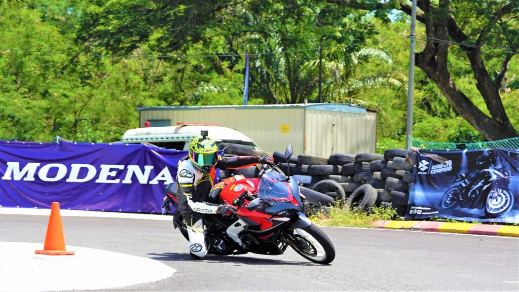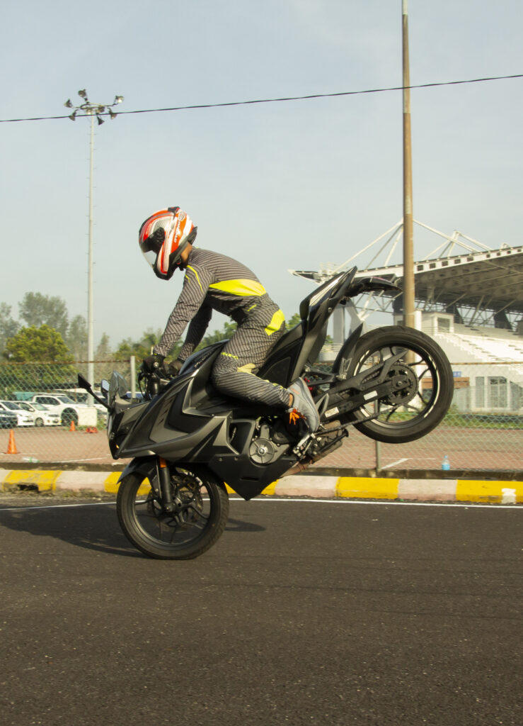 Equipped with ByBre front single channel ABS and mated to a 6-speed gearbox, five step adjustable and Nitrox rear mono shock absorbers giving a sportier riding experience and stock grip by MRF Tyres, pretty grippy for the Litar Rakyat Circuit.