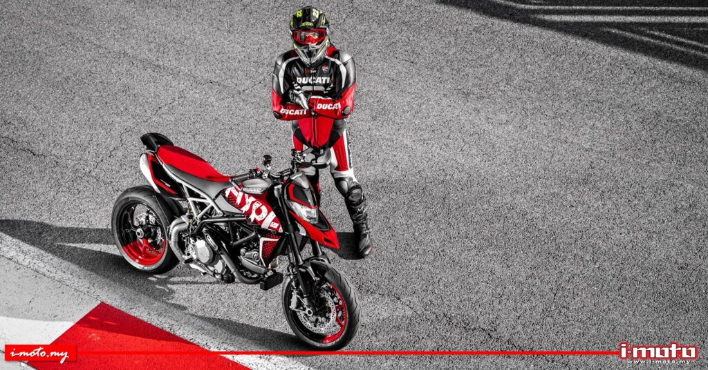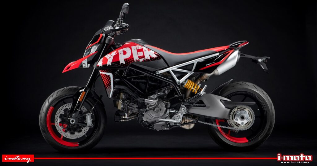 The Hypermotard 950 RVE is characterized by a livery called “Graffiti” that is inspired by street art. This new 950 variant fun-bike sits between the entry model and top range 950 SP.