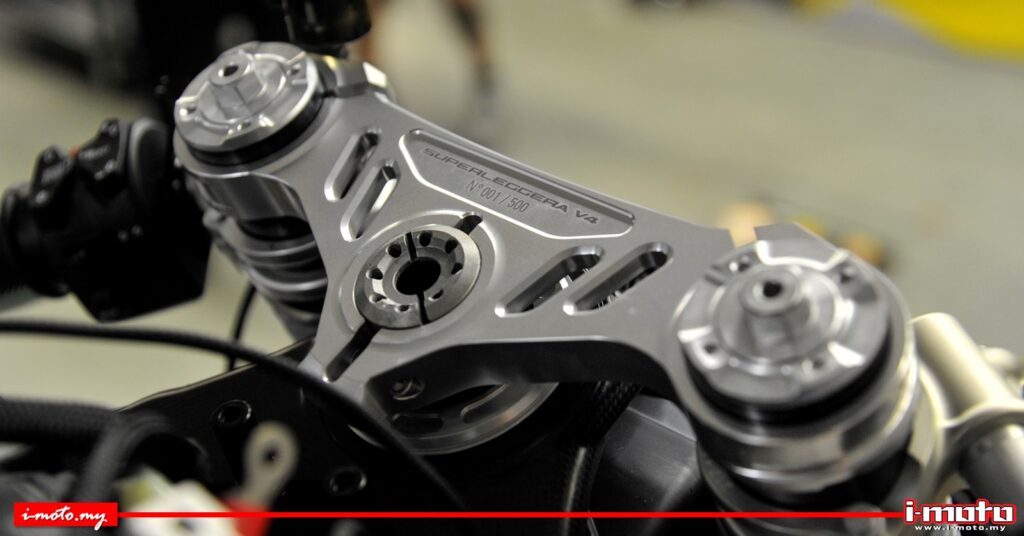 The exclusivity of the materials and technical solutions adopted on the Superleggera V4 are also reflected in the maximum number of motorcycles envisaged: 500 numbered units accompanied by a certificate of authenticity. The progressive numbering of the motorcycles (XXX/500), coinciding with the chassis number, is shown on the steering head, and on the ignition key.